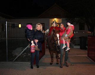 Foto 1: (v.l.n.r.) Kindergartenleiterin Brigitte Szukits mit Klara, Alexander als Heiliger Martin und Pferdebesitzerin Manuela Baldauf mit Gloria