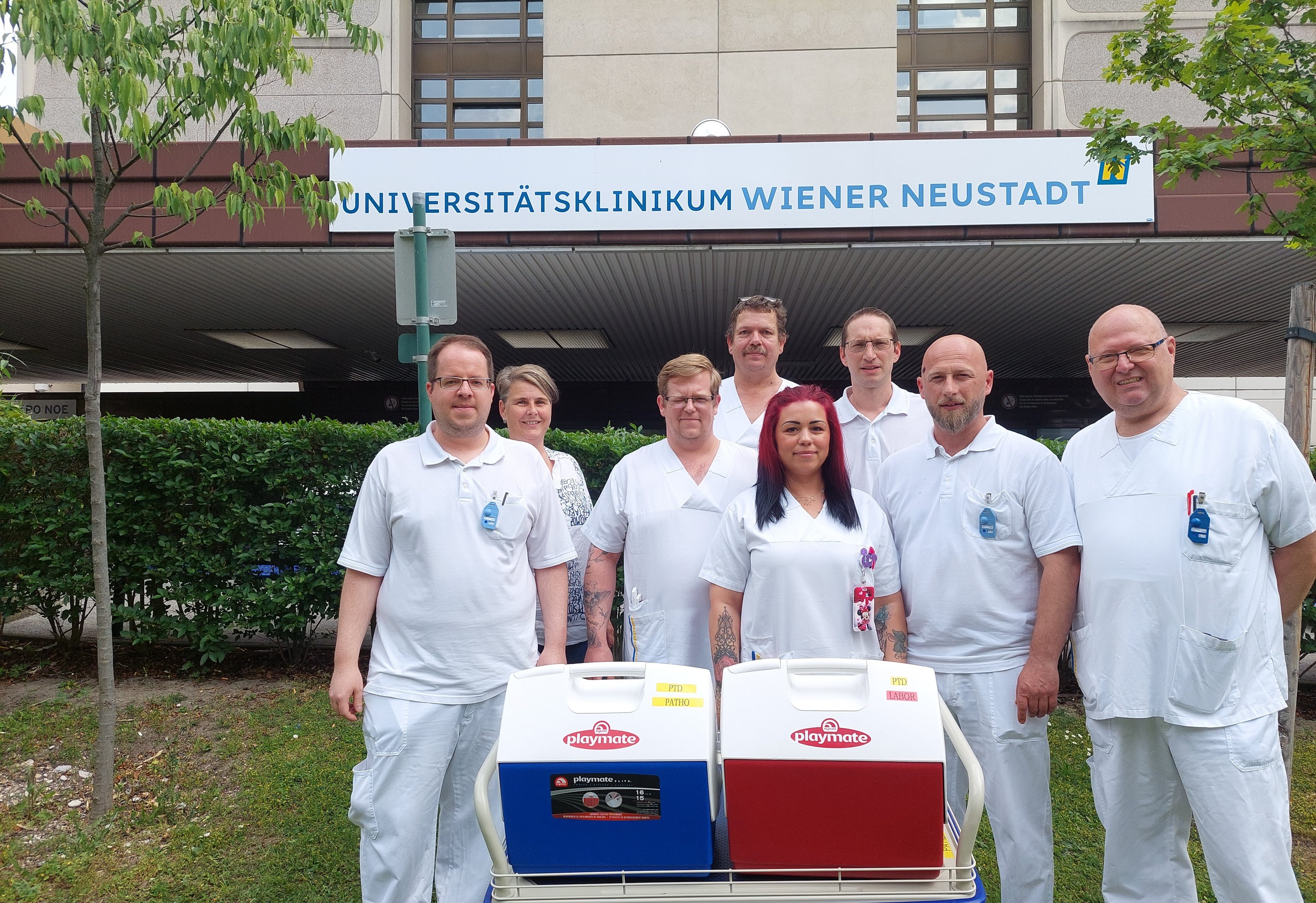 Ein Teil des Teams das sich um den sicheren Probentransport im Universitätsklinikum Wiener Neustadt kümmert: (v.l.n.r.) Erich Sommer, DGKP Irene Kargl, Stefan Probst, Maria Karbun, Bernhard Scheiber, Bljerim Ramadani, Manuel Starkl, Andreas Fau